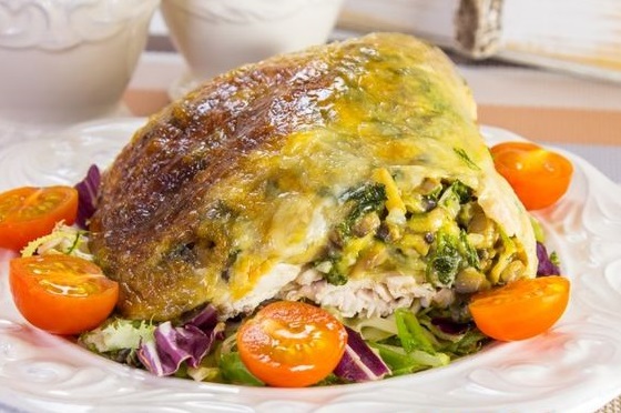 Фаршируем курицу: под кожу со стороны грудки выкладываем нашу начинку, затем внутрь курицы кладем лимон, предварительно сделав на нем надрезы. Смазываем курицу майонезом натираем специями по вкусу и кладем на противень или форму. Также рядом можно положить различные овощи, например, картофель, морковь, тыкву, кабачок – и у вас будет полноценный ужин.