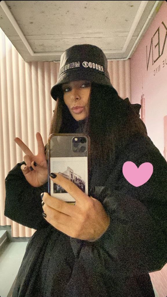 Злата Огневич любит выделяться, поэтому выбрала капор лавандового цвета с белыми шнурками-завязками. Артистка носит трендовый головной убор с черным пуховиком оверсайз.