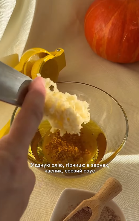 3. Разрежьте капусту на большие порционные куски, сложите в емкость и залейте соусом из растительного масла, меда, лимонного сока, соевого соуса, горчицы, соли и чеснока.