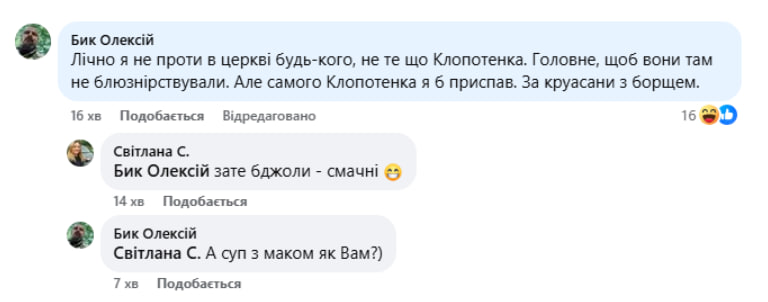 "Лично я не против в церкви любого, не то что Клопотенко. Главное, чтобы они там не кощунствовали. Но самого Клопотенко я бы усыпил. За круассаны с борщом", – написал Бык в комментариях под сообщением блогера Виталия Чепиноги.