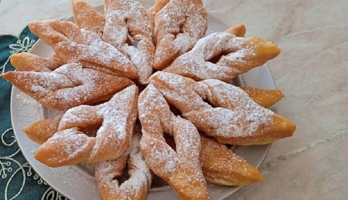Замесите эластичное тесто, оставив его отдыхать на 20 минут. Раскатать не очень тонко, нарезав полосками и ромбами. Посредине сделать надрез и вывернуть одну сторону.