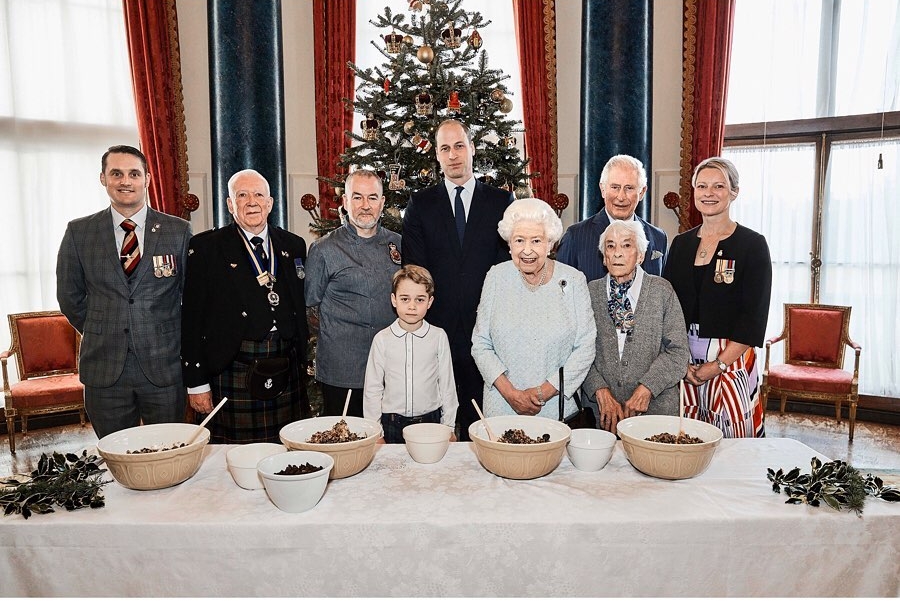 Британская королевская семья поделилась очаровательным фото 6-летнего принца Джорджа, который готовит рождественский пудинг в окружении отца Уильяма, дедушки Чарльза и прабабушки Елизаветы.