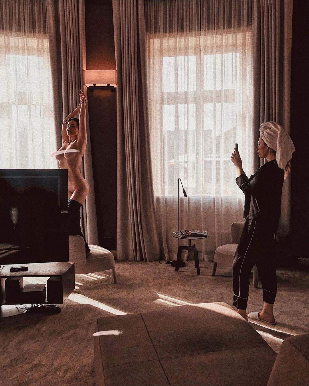 На фото артистка позирует перед камерой телефона подруги-фотографа Сони Плакидюк полностью обнаженной. Даша стоит на стуле, подняв руки вверх, демонстрируя интимные части своего тела.