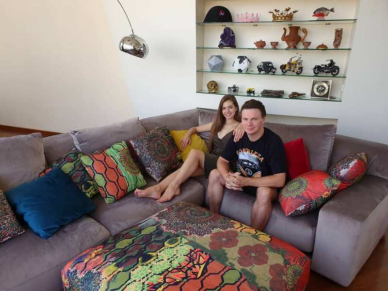 Автор проекта "Мир наизнанку" Дмитрий Комаров и победительница конкурса красоты "Мисс Украина 2016" Александра Кучеренко после свадьбы обустраивают квартиру. Супруги купили огромный диван, который разместился в гостиной. Правда, мебель влюбленные покупают в арендованную квартиру, поскольку своим жильем пока не обзавелись.