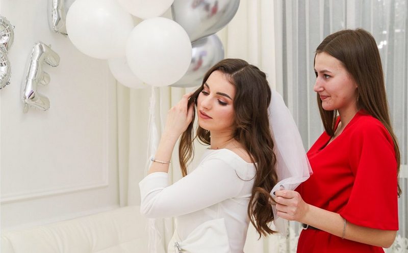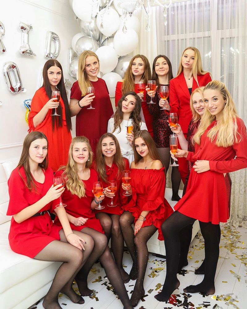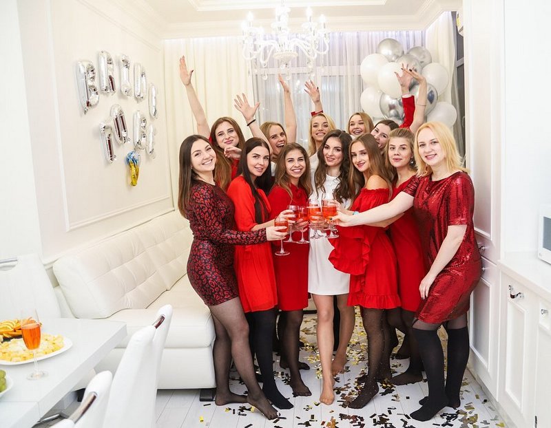 Для девичника юная невеста выбрала скромное белое платье с большим бантом на поясе. Голову девушки украшала коротенькая фата. Подружки невесты нарядились в наряды в одной цветовой гамме. Все девушки появились на празднике в красных платьях и черных колготках.