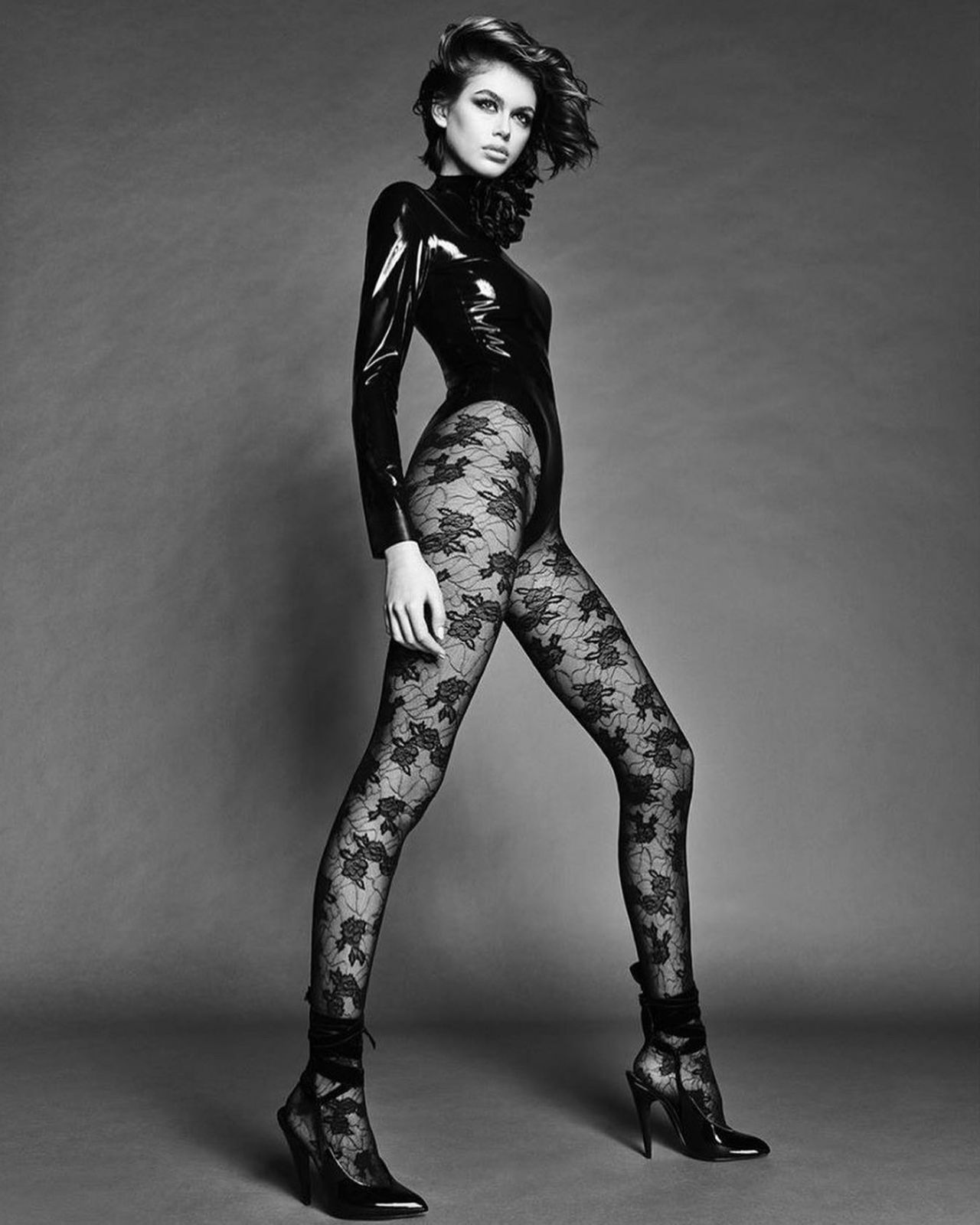 Модель позировала в латексе, кружевах, а также полностью обнаженной, оттеняя белизну кожи эффектными черными ботфортами. В комментариях, которые пользователи оставили под фото в Instagram, отмечают ее необычайную схожесть с матерью.