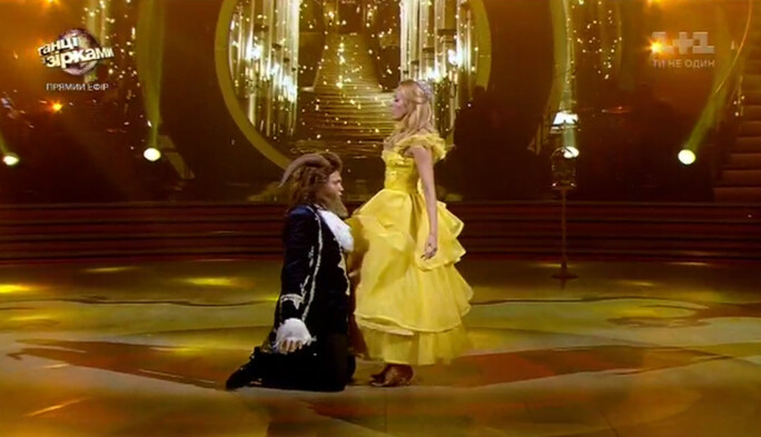 Суперблондинка и ее партнер Степан Мисюрка во втором прямом эфире станцевали вальс. Пара появилась на паркете в образах Красавицы и Чудовища.