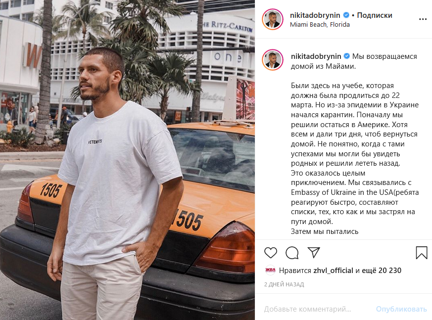 Никита и Даша отправились в Майами (США) на учебу, там они должны были пробыть до 22 марта. После того, как эпидемия коронавируса набрала обороты, пара приняла решение вернуться домой. Однако при поиске билетов влюбленные столкнулись с трудностями.