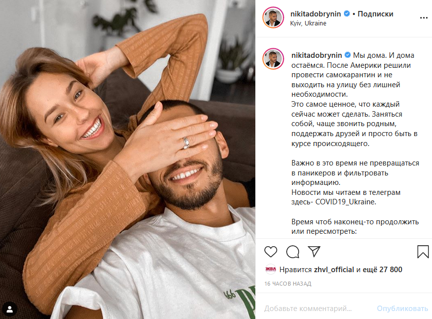Герой реалити-шоу "Холостяк-9" Никита Добрынин и победительница проекта, а теперь уже и его невеста, Даша Квиткова с трудом вернулись в Украину из США, а теперь находятся на самоизоляции.