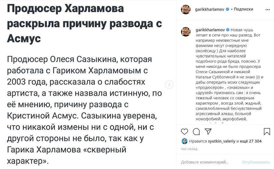 Пост Гарика Харламова в Инстаграм