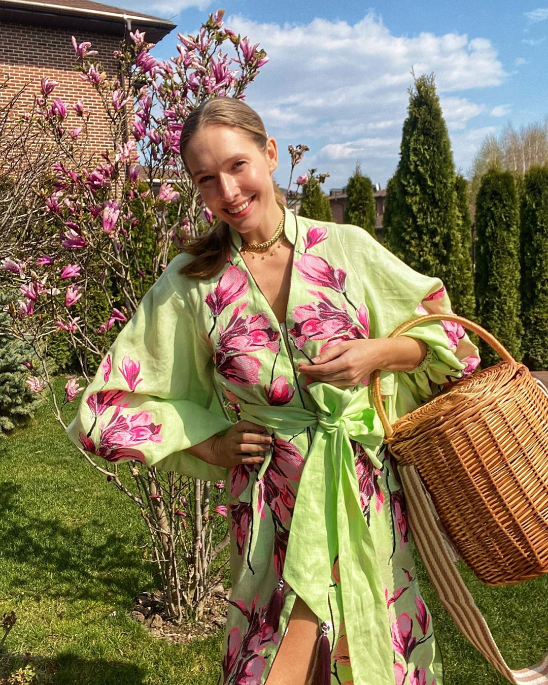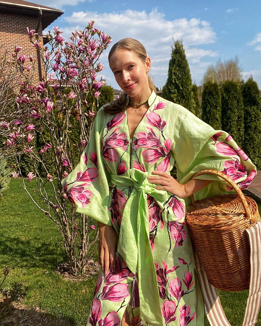 "Пасха в нашей семье особенный праздник, когда семья вместе, когда паска на завтрак, обед и ужин. Когда стол большой и за ним много близких и родных. В этом году грустим, что не можем поехать с корзинками к родителям и друзьям, но дистанционно поздравляет всех и надеемся на скорые встречи. Но даже дома праздник - это повод нарядиться. Особенно когда во дворе магнолии точно такие же, как на платье", - написала Осадчая.