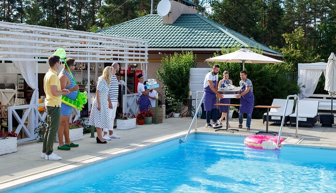Участники разделятся на 2 команды, и у них будет всего 4 часа на приготовление тортов. Участников реалити будет ждать неожиданный сюрприз - чтобы доставить свои десерты, кондитеры должны переплыть бассейн.