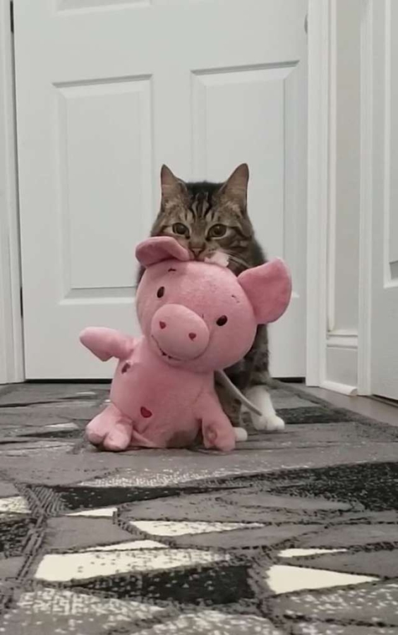Диего и его игрушка все время вместе: он не покидает ее во сне, играет с ней и берет на кухню во время еды. Затем кот чистит свинку так, будто это его собственный котенок. Всякий раз, когда Диего везут к ветеринару, хозяевам приходится брать с собой и ее.