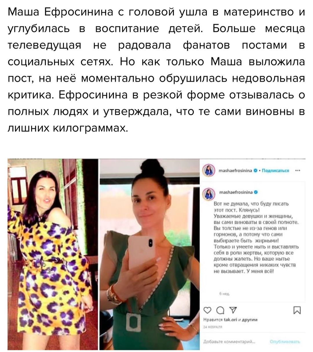 "Вы серьезно? Ну, правда... Вот давайте сейчас, откройте ЛЮБОЙ из моих постов - я вот так пишу? Я вот так высказываюсь о людях, проблемы которых мне известны лучше, чем тем, кто эти статьи царапает? Я, человек, который победил много лет назад лишний вес, занявшись ИСКЛЮЧИТЕЛЬНО СВОИМ ЗДОРОВЬЕМ, хоть раз призывала вас глотать дерьмо или порошки от какой-то тети Ани? - возмущается Ефросинина. - Я, которая говорит: не закладывайте в себя НИЧЕГО сомнительного происхождения, не занимайтесь самолечением, обращайтесь только к докторам в случае проблем с весом: к эндокринологам, гинекологам и неврологам - могу все-таки вызвать у вас веру в такие вот несущиеся по интернету "советики"?? Ну, почему же, несмотря на миллион опровержений известных людей подобных материалов в сети, вам все равно легче верить в чудо-зелье, чем в один забор анализа крови на гормоны и биохимию и один прием квалифицированного специалиста?"