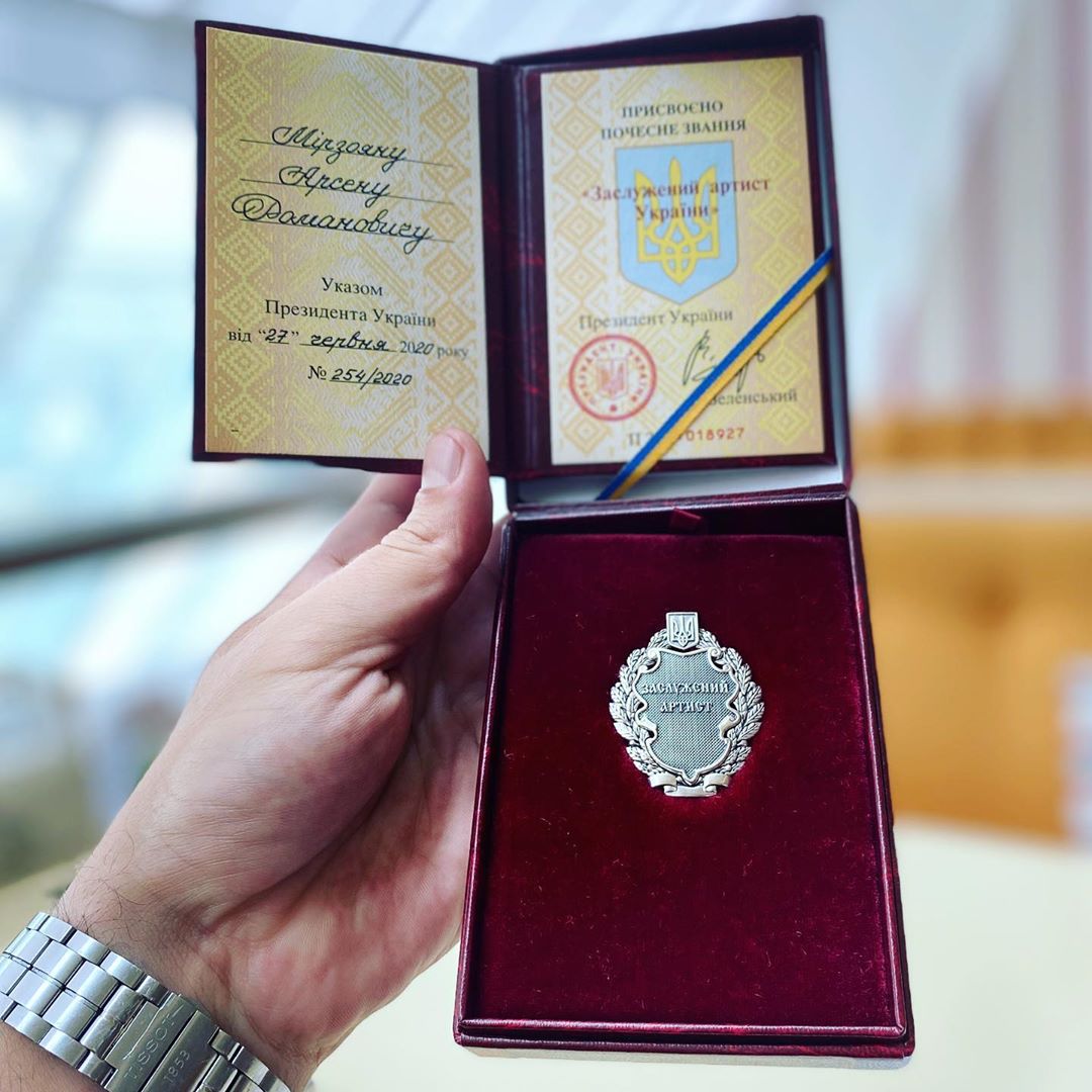 Звание заслуженного артиста Украины также присвоили Арсену Мирзояну. Певец поделился фото награды с поклонниками и написал: "Держу фасон. Спасибо!"