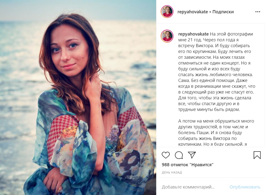 "На этой фотографии мне 21 год. Через полгода я встречу Виктора. И буду собирать его по крупинкам, - написала она. - Буду лечить его от зависимости. На моих глазах отмениться не один концерт. Но я буду сильной и изо всех буду спасать жизнь любимого человека. Сама. Без единой помощи. Даже когда в реанимации мне скажут, что в следующий раз уже не спасут его [...] А потом на меня обрушиться много других трудностей, в том числе и болезнь Паши. И я снова буду собирать жизнь Виктора по крупинкам. Но я буду сильной, я буду рядом, буду его опорой. Потому что я нужна ему, как никогда".