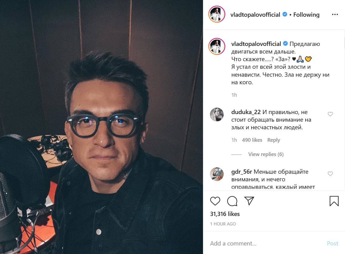 Музыкант Влад Топалов после скандала в соцсетях, вызванного неосторожными высказываниями его супруги Регины Тодоренко о домашнем насилии, решил пойти с подписчиками на мировую.