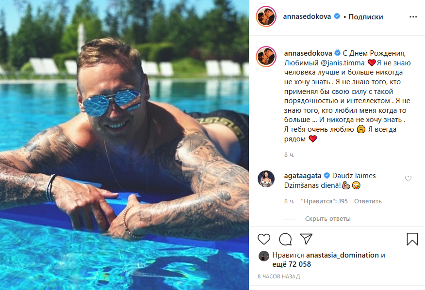 2 июля свой день рождения отмечает Янис Тимма - латвийскому баскетболисту исполняется 28 лет. Возлюбленная спортсмена Анна Седокова публично поздравила именинника в соцсетях, оставив чувственное послание.