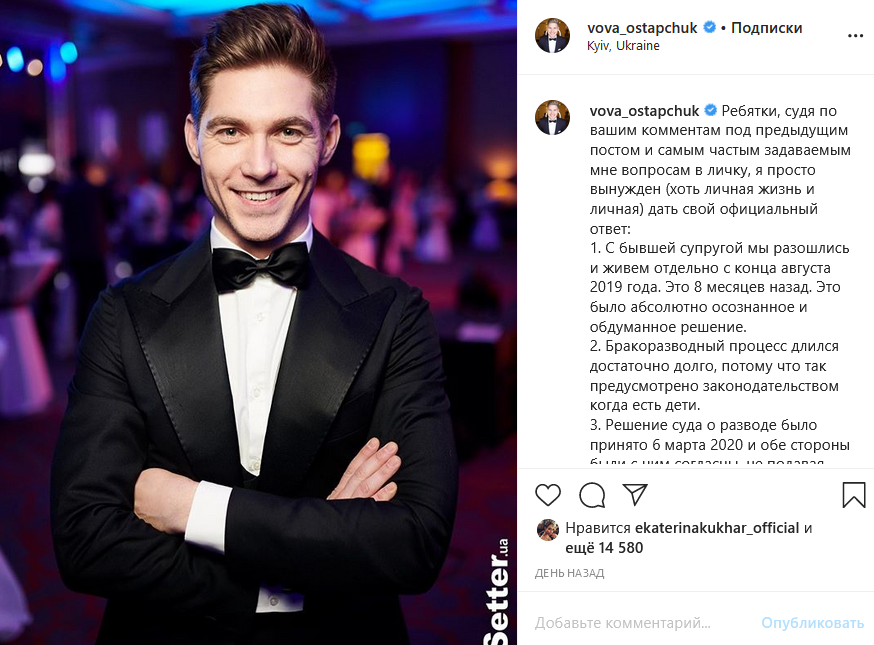 "С бывшей супругой мы разошлись и живем отдельно с конца августа 2019 года. Это 8 месяцев назад. Это было абсолютно осознанное и обдуманное решение. Бракоразводный процесс длился достаточно долго, потому что так предусмотрено законодательством когда есть дети. Решение суда о разводе было принято 6 марта 2020 и обе стороны были с ним согласны, не подавая апелляций", - заявил Остапчук.
