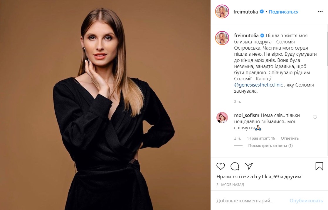 Телеведущая Ольга Фреймут, некогда звезда проекта "Ревизор", посвятила пост в Instagram погибшей в ДТП коллеге и близкой подруге Соломии Островской.