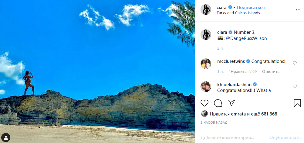 Артистка опубликовала фото, на котором запечатлена с большим животиком. Певица позирует в бикини на вершине скалы, расположенной на островах Теркс и Кайкос. "Номер 3", - подписала фотографию Сиара.