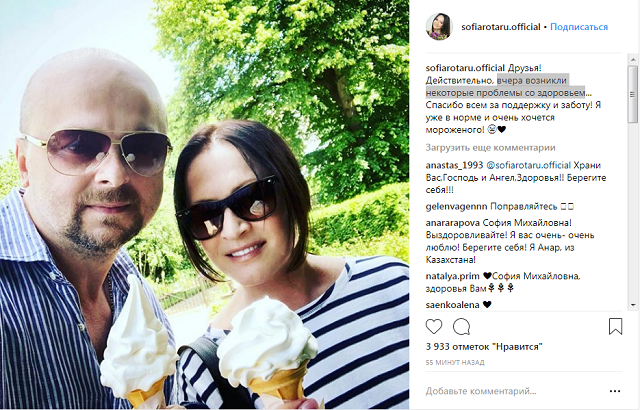 "Друзья! Действительно, вчера возникли некоторые проблемы со здоровьем... Спасибо всем за поддержку и заботу! Я уже в норме и очень хочется мороженого!", – написала Ротару в подписи к фотографии.