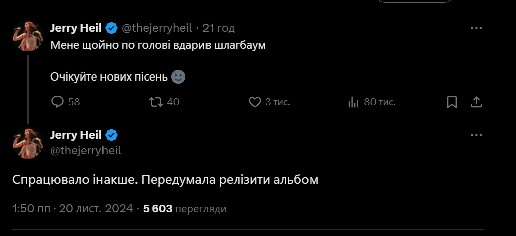 "Меня только что по голове ударил шлагбаум. Ожидайте новых песен…", – написала она.