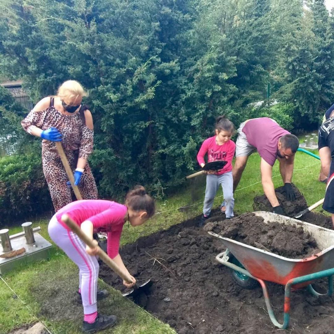 Публикация знаменитости вызвала у ее поклонников немало вопросов: "А почему дома в маске?" - удивляются они. - "Ой, вы красоту нарушили, был такой газон!" "Лопаты девочкам нужно было купить поменьше".