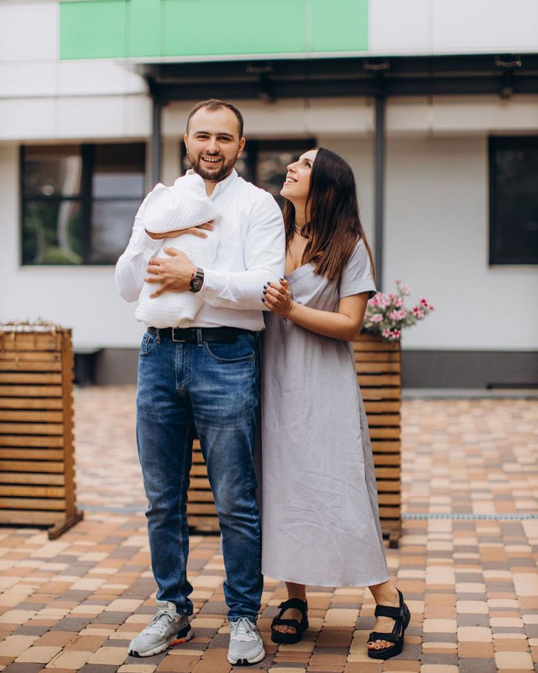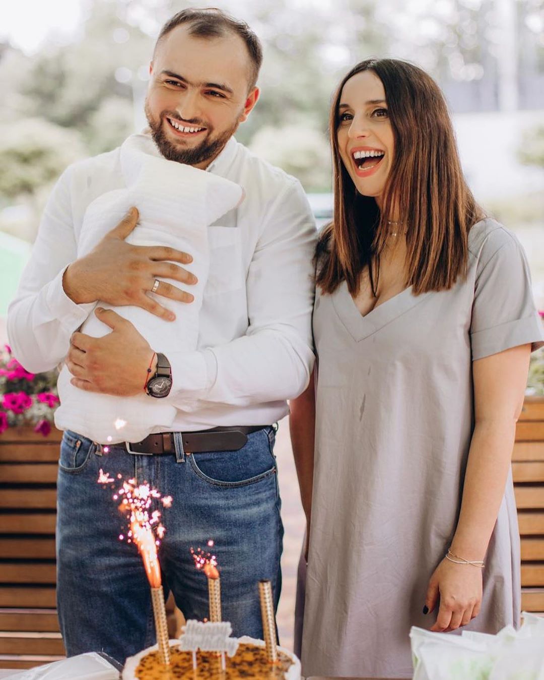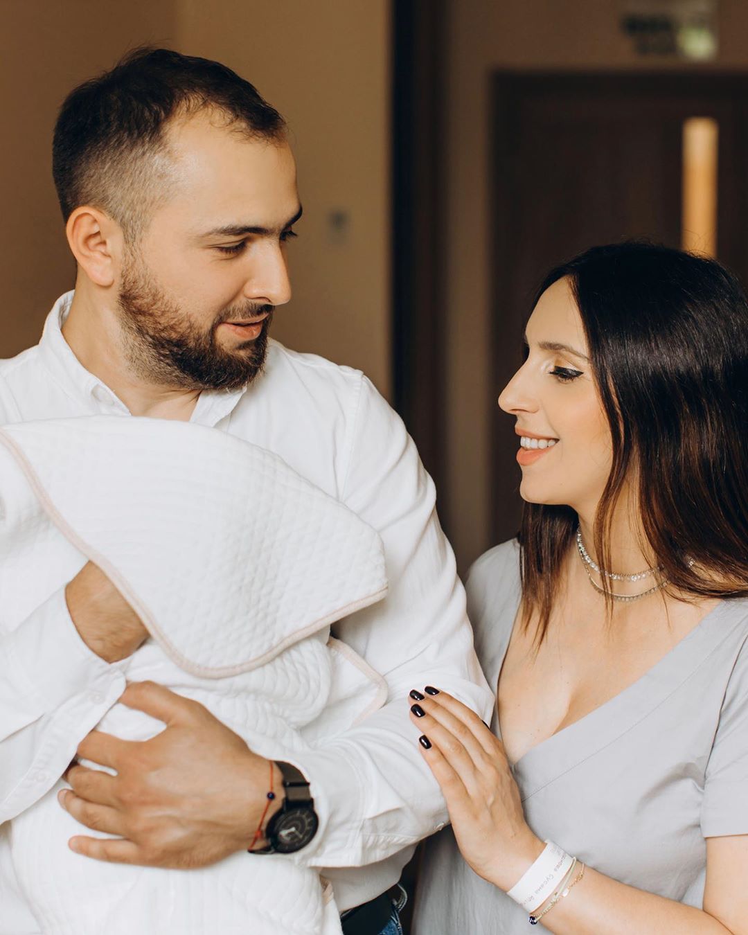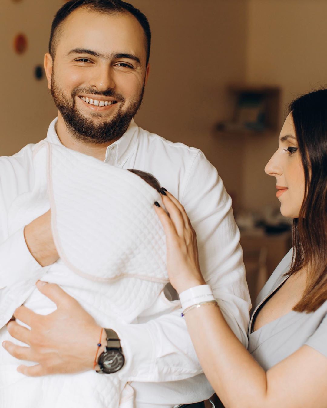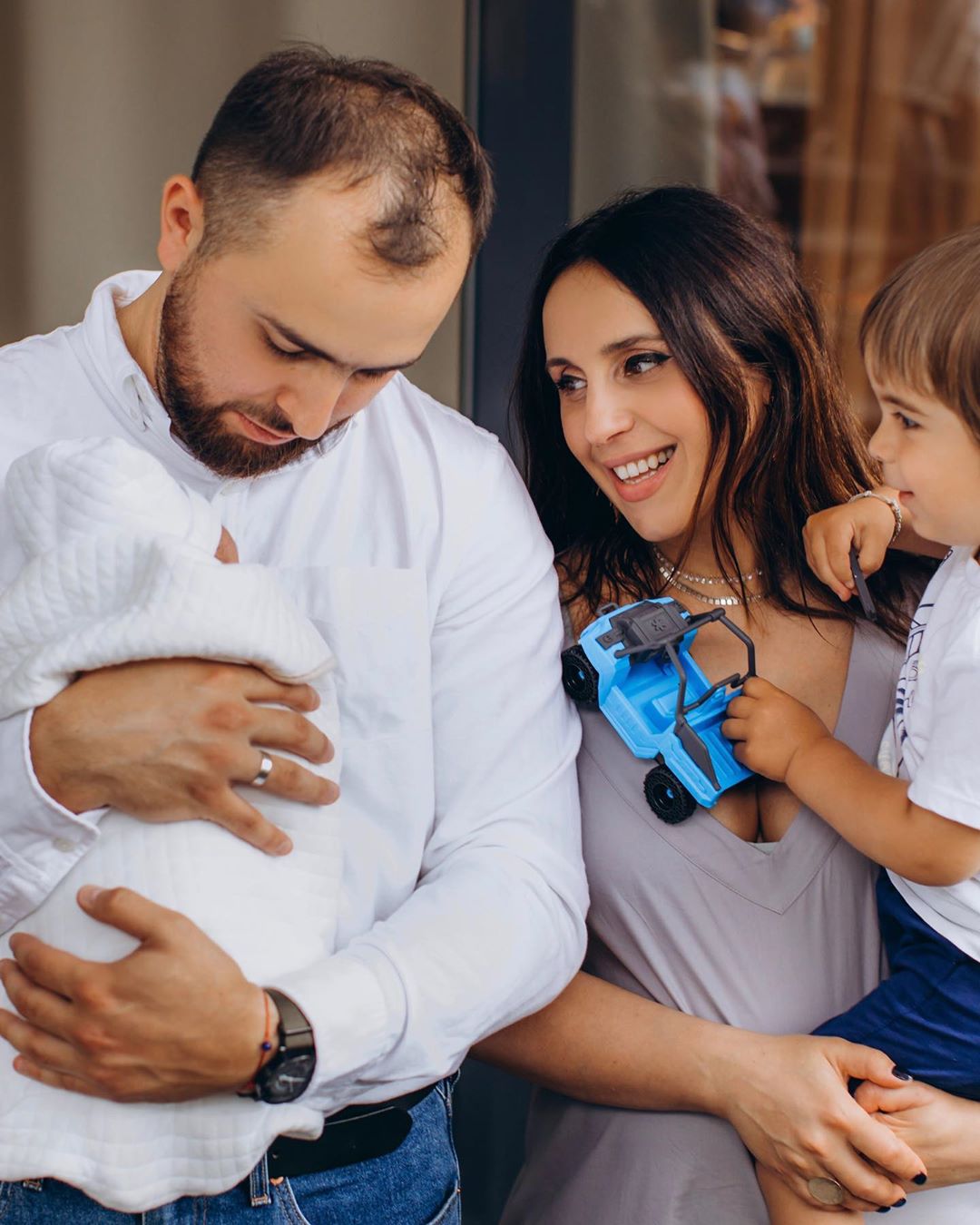 На фото счастливая Джамала позирует рядом с мужем Бекиром Сулеймановым и двумя сыновьями. 2-летний Эмир на руках у мамы с интересом и улыбкой смотрит на младшего брата, пока заботливый отец нежно прижимает его к груди.
