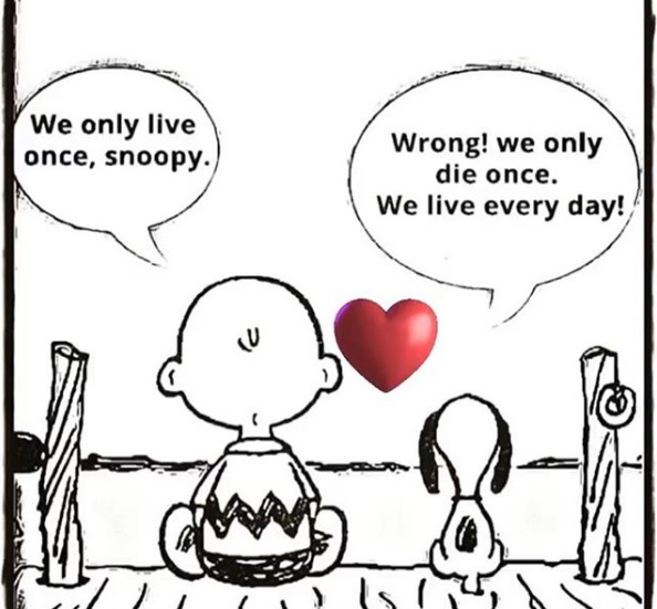 "Мы живем только один раз, Снупи", - говорит Чарли Браун, на что его любимый пес отвечает: "Неправильно! Мы умираем только один раз. Мы живем каждый день!"