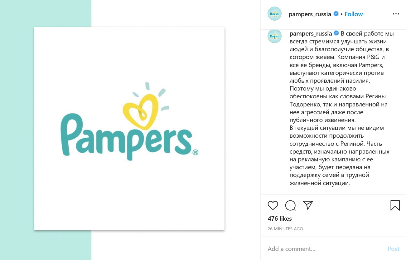 "Компания P&G и все ее бренды, включая Pampers, выступают категорически против любых проявлений насилия. Мы одинаково обеспокоены как словами Регины Тодоренко, так и направленной на нее агрессией даже после публичного извинения. В текущей ситуации мы не видим возможности продолжить сотрудничество с Региной", - объявили на страницах брендов в соцсетях.