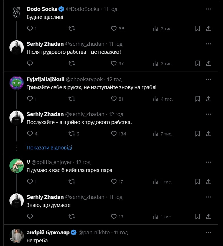 страницы писателя увидели в этом диалоге и, в частности обращении Жадана к своей экс-девушке, намек на воссоединение медийной пары.