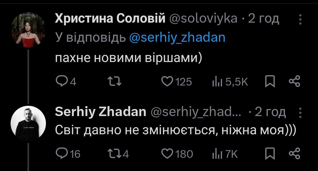 В частности, Жадан выложил иронический твит с заголовком статьи о нем и его службе в армии, а в комментарии к нему пришла Христина Соловий.