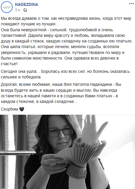 В среду, 18 марта, ушла из жизни украинский дизайнер Натэлла Надеждина, владелица бренда NADEZDINA, у которой одевались звезды шоу-бизнеса.