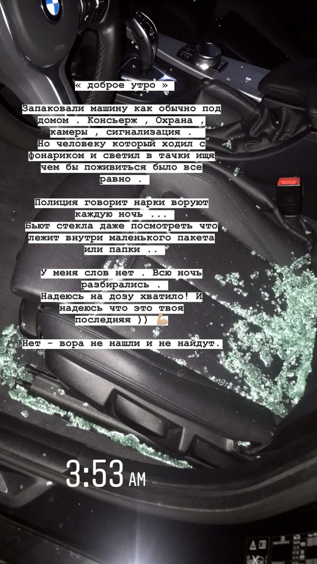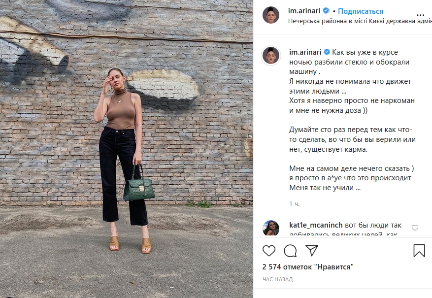 "Как вы уже в курсе ночью разбили стекло и обокрали машину. Я никогда не понимала что движет этими людьми...Хотя я наверно просто не наркоман и мне не нужна доза. Думайте сто раз перед тем как что-то сделать, во что бы вы верили или нет, существует карма", - написала Арина.