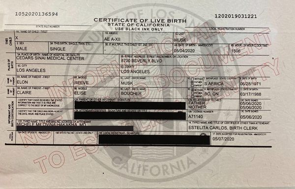 Согласно документу, основное имя мальчика - X, а среднее, которое располагается между личным именем и фамилией, - AE A-XII. Похоже, близкие будут называть ребенка просто Х (Экс).