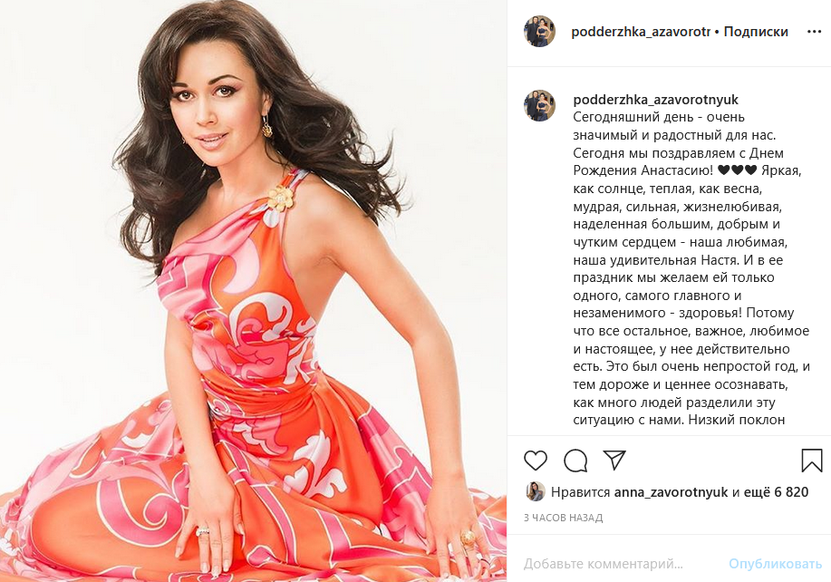 Поздравительный пост также появился и в Instagram-аккаунте "Поддержка Анастасии Заворотнюк", который был создан близкими и коллегами актрисы для борьбы с фейками.