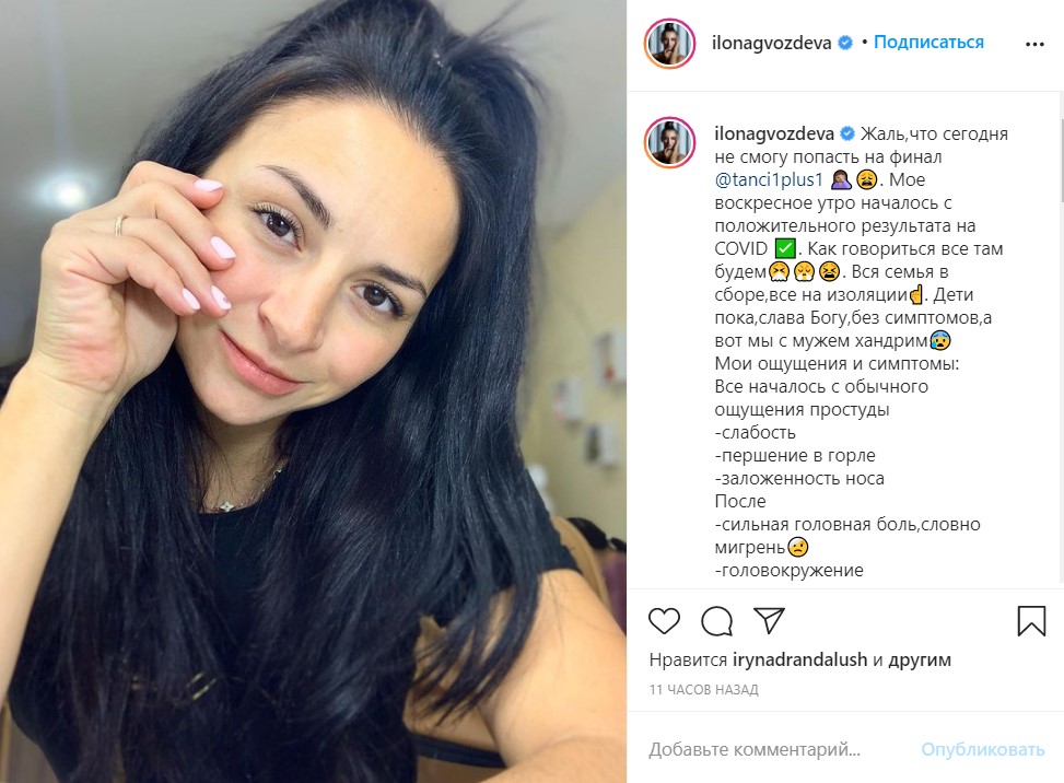 По словам танцовщицы, заболел и ее супруг. У детей симптомы болезни не наблюдаются, при этом вся семья Гвоздевой отправилась на изоляцию.