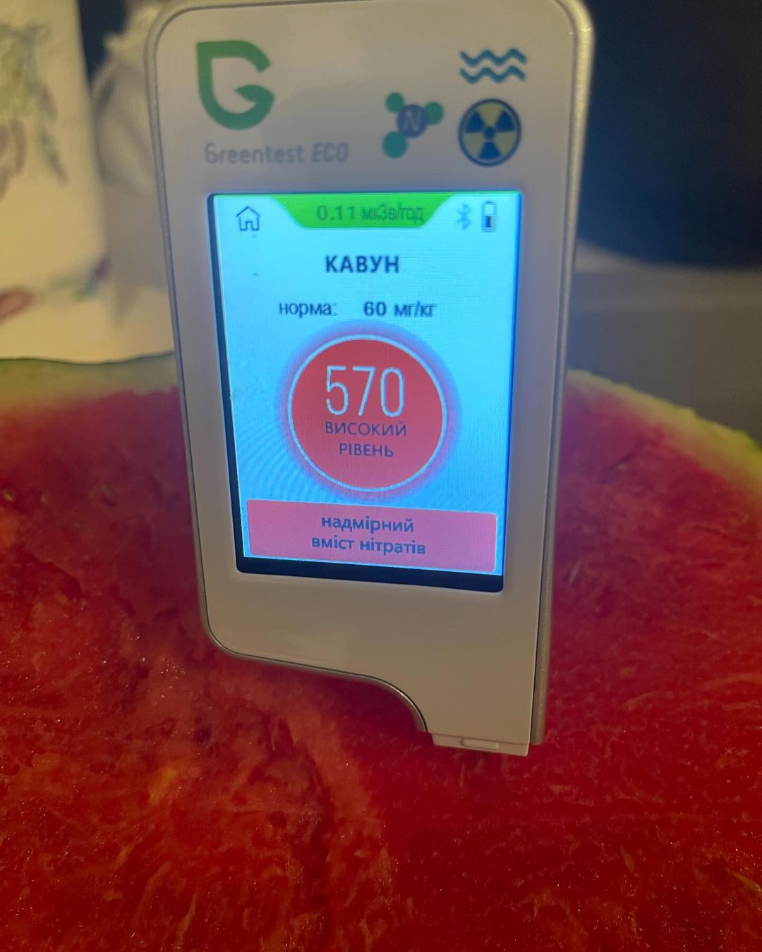 На показателе видно, что при норме нитратов 60 мг/кг в этом арбузе – 570 мг/кг. То есть чрезмерное содержание нитратов.