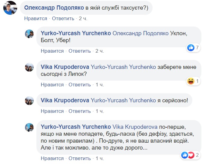 В комментариях фолловеры поддержали артиста, но не сразу поверили словам о такси. В ответ на это Юрченко охотно согласился назвать службы, в которых подрабатывает.