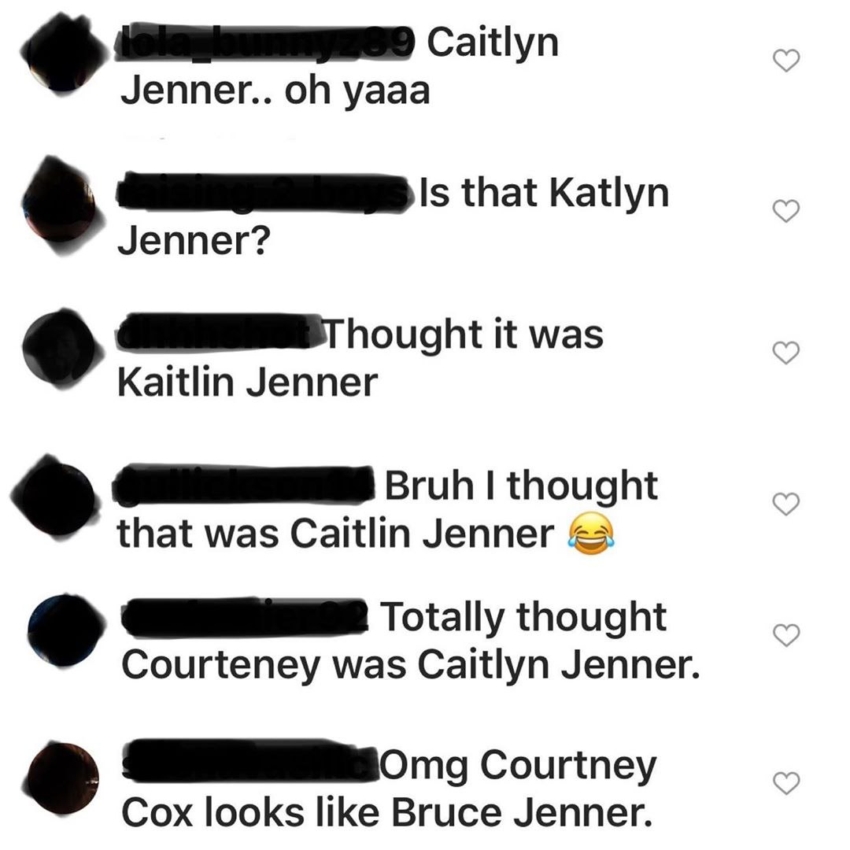 "Опубликовав это фото, я действительно не думала, что похожа на себя. Но это было удивительно", - написала 55-летняя актриса, приложив скриншот с комментариями: "Это Кейтлин Дженнер?", "О боже мой, Кортни Кокс выглядит как Брюс Дженнер", "Мне правда показалось, что Кортни - это Кейтлин Дженнер".