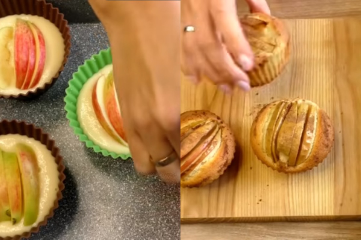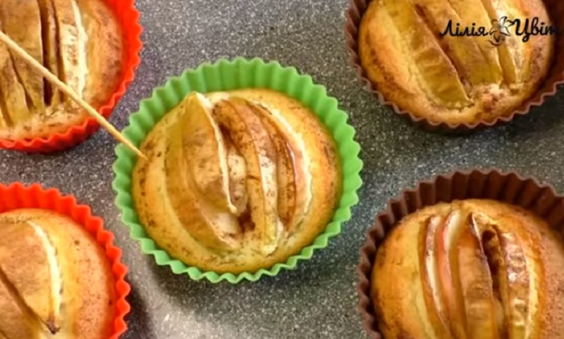 Тестом наполнить силиконовые формы на 2/3. Сверху украсить яблочными слайсами.