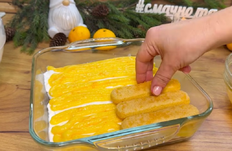 В стеклянной емкости выложить слоями ингредиенты: сначала печенье, насыщенное мандариновой массой. Сверху - сливочный крем и разровнять поверхность.