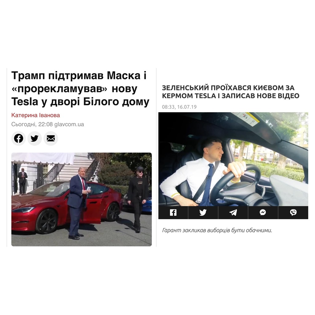 Журналистка Марина Данилюк-Еромолаева же считает, что Трамп не только "ворует" ископаемые, но и пиар", опубликовав фото Зеленского за рулем Teslа.