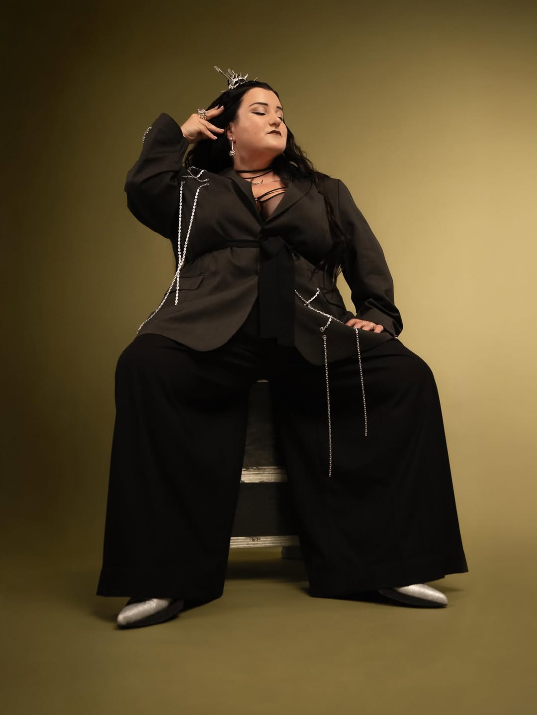 Женщина позировала в брюках черного цвета и пиджаке с серебристыми цепочками. Попутно певица продемонстрировала пышный бюст в белье интересного дизайна.