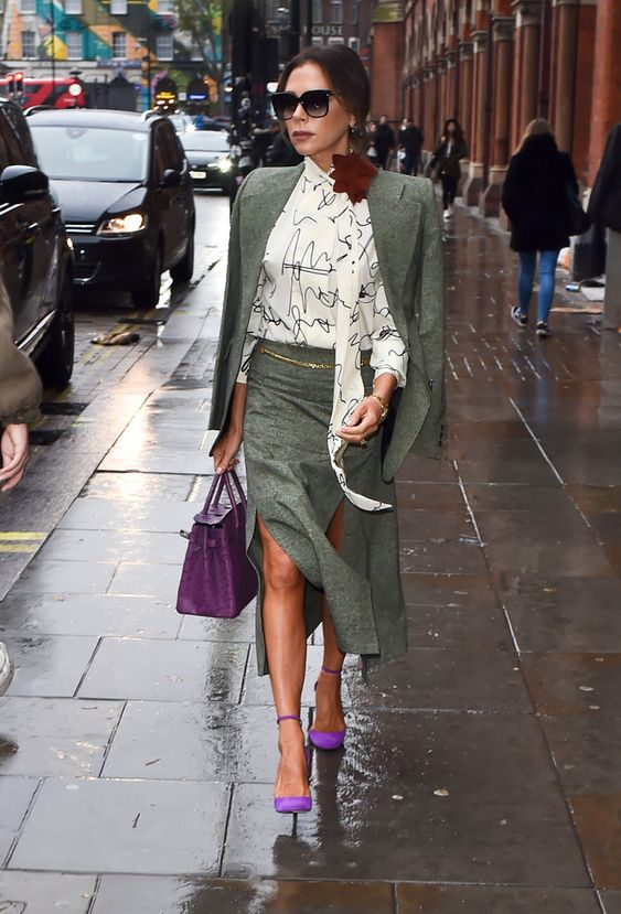 Виктория Бекхэм подтверждает, что даже с серым костюмом можно составить непревзойденный образ. Для этого дополнить лук белой принтованной блузой, брошью и яркими аксессуарами – фиолетовой обувью и сумкой.