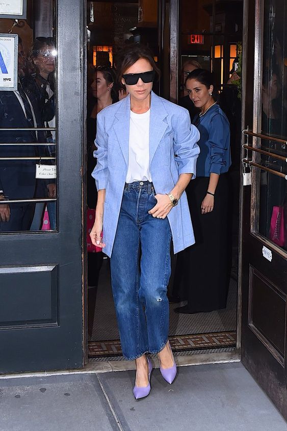 Несмотря на то, что Бекхэм в свои 46 лет может похвастаться точеной фигурой, она следует последним трендам и часто носит пиджаки оверсайз и широкие джинсы. Как например, этот образ, который она дополнила белой футболкой и элегантными лодочками.