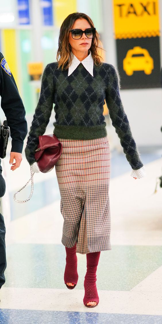 Если вы не знаете, какой лук составить с любимой юбкой, то посмотрите, как это делает Виктория. Она подобрала аксессуары в тон к принту юбки, а верх выбрала довольной экстравагантный – свитер с ромбами и блуза с большим воротником.