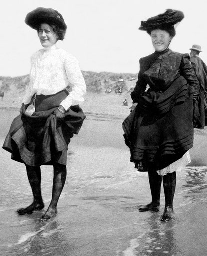 Отметим, что в конце XIX – начале XX в. было не принято оголяться на пляже. Поэтому девушкам и женщинам приходилось принимать солнечные ванны и купаться в достаточно объемных штанах или длинных платьях, что приносило массу неудобств. Архивные фото тех времен публикует Vogue.
