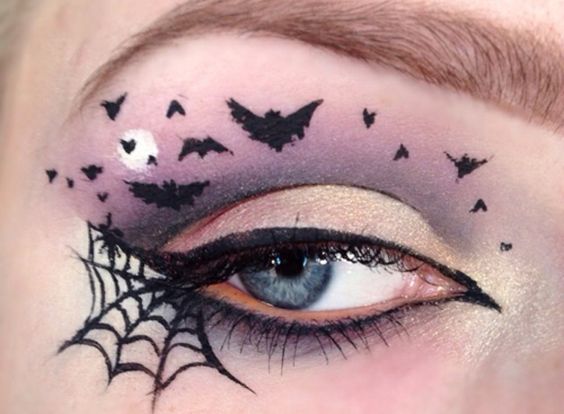 Тот, кто умеет неплохо рисовать, может сотворить настоящую картину, используя тени и подводку для глаз. Это может быть паутина, паучки, летучие мыши, луна – главное не переборщить с персонажами.